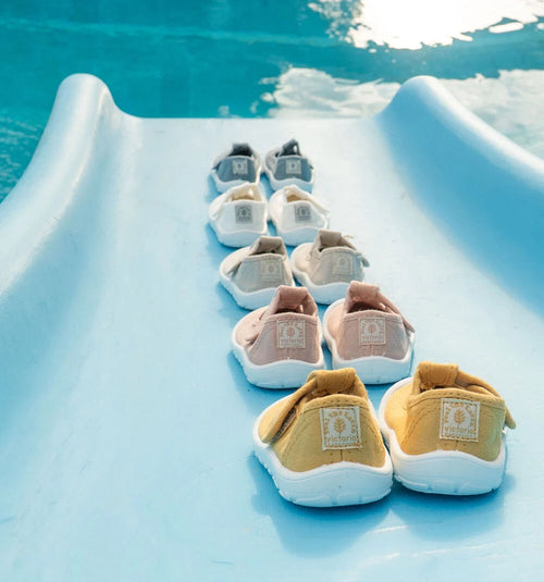 Sapatilhas de lona Barefoot para crianças, feitas com algodão reciclado DREC® e algodão ecológico. Super flexíveis, leves e sem reforços, garantem um ajuste natural, permitindo o movimento livre dos pés sem os deformar. O fecho em velcro facilita o calçar, enquanto a sola plana antiderrapante e a palmilha removível e lavável proporcionam conforto, equilíbrio e segurança. Um calçado sustentável e ideal para o desenvolvimento saudável dos pés infantis.