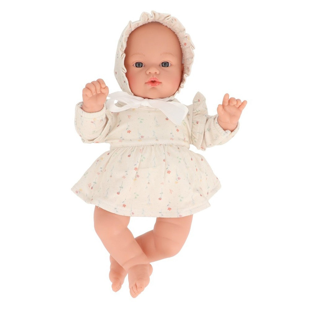 Esta boneca inclui um vestido em algodão com fechos nas costas e um adorável chapéu de bebé com laço, tudo pensado para proporcionar uma experiência de brincadeira completa e cheia de ternura.